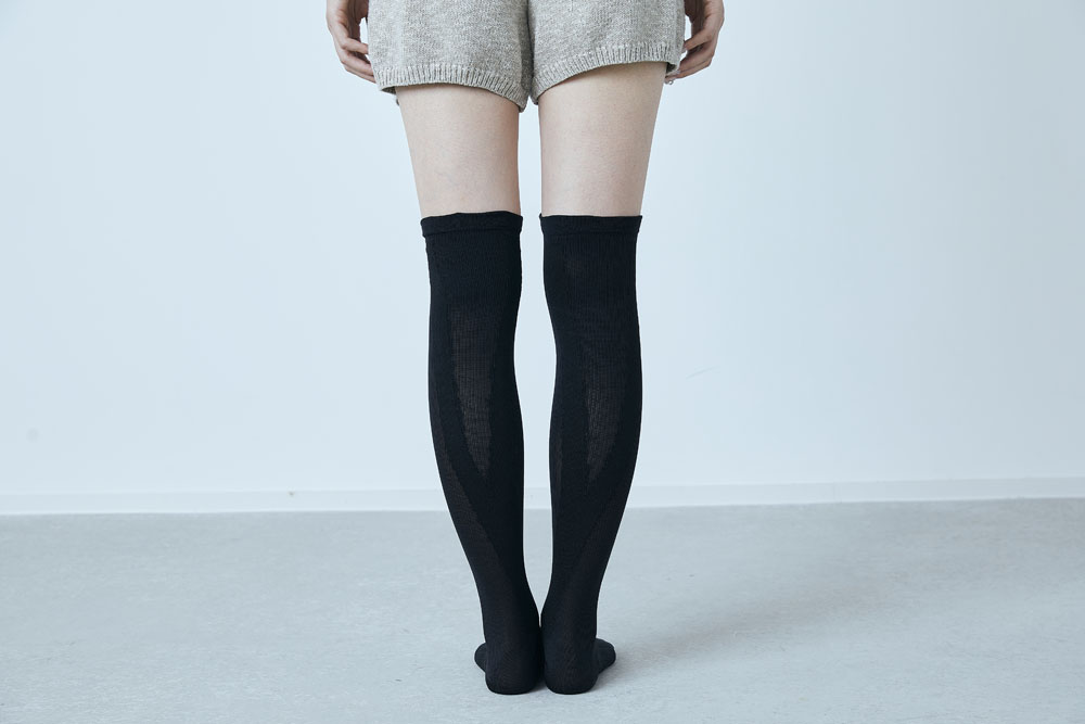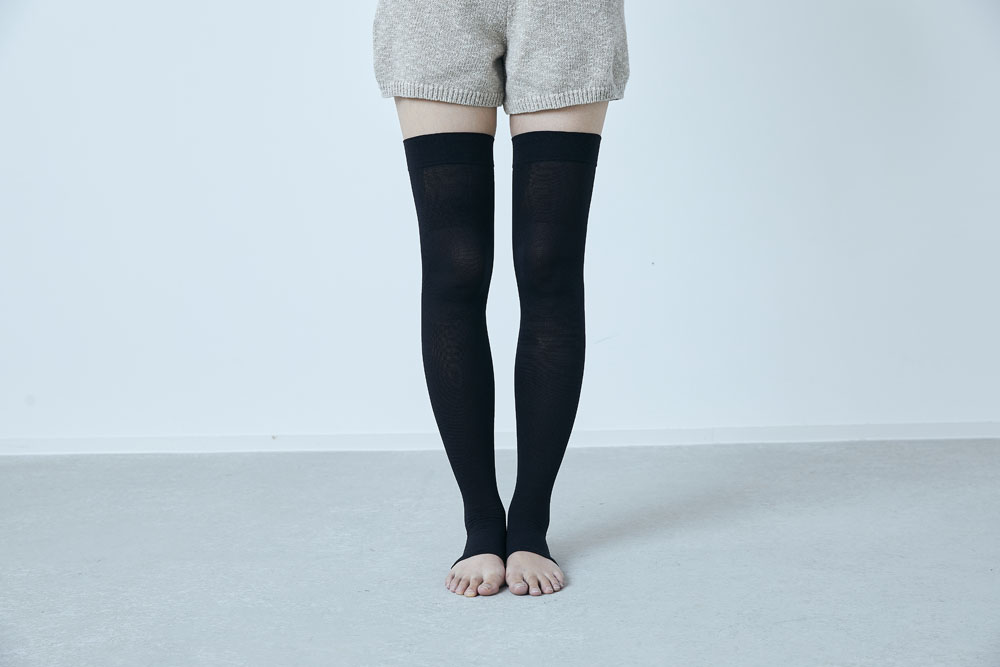 足首の部分をしっかり正しく合わせてから、シワや重なりができないようにゆっくりと上の方へと引き上げていきます。