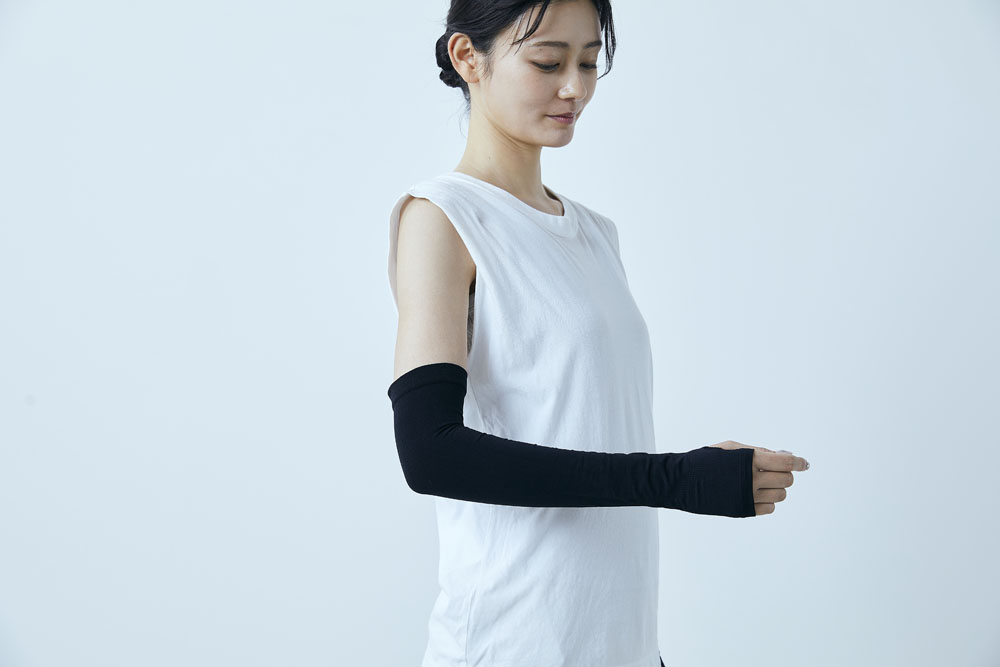 まず本製品をたぐり寄せて手を通し、親指を穴に入れてください。