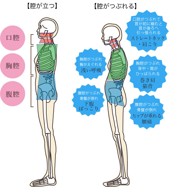腔が整うということは、構造体として安定するので、立ったり歩いたりが楽になるだけでなく、内蔵の収まる空間が広がるということなので、内蔵の働きが良くなり、健康増進に繋がります。