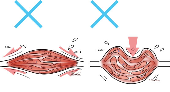 コリの状態を解消するために、一般的には、押したり・揉んだり・引っ張ったり…ということが行われていますが、さとう式では、それらを行わずに、筋肉に優しく触れたりゆらしたり、という超微弱刺激を加えることにより、優しくゆるめていきます。